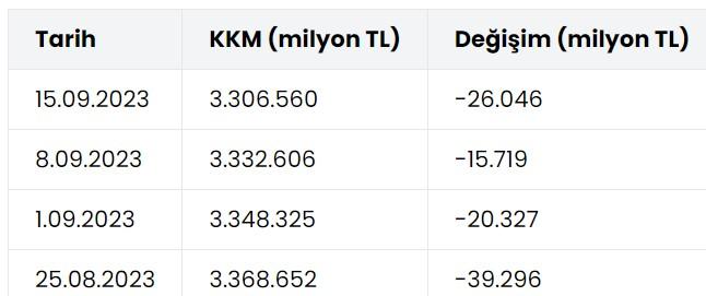 Eski Hazine ve Maliye Bakanı Nureddin Nebati'nin "asrın buluşu" olarak tanımladığı KKM'den çıkış, Merkez Bankası'nın bankalara getirdiği tüm kısıtlamalara rağmen oldukça yavaş ilerliyor. Merkez Bankası’nın (TCMB) kur korumalı mevduat (KKM) hesaplarını azaltmaya yönelik adımları yavaş da olsa sonuç vermeye başladı. Bankacılık Düzenleme ve Denetleme Kurumu’nun (BDDK) 15 Eylül haftasında KKM hesapları 26 milyar 46 milyon TL azaldı. Böylece KKM hesapları 3 trilyon 306 milyar 560 milyon lira ile son 6 haftanın en düşük seviyesine geriledi. 15 Eylül haftasındaki düşüşle birlikte 2022 Şubat ayında KKM hesaplarında ilk kez 4 hafta üst üste düşüş yaşanmış oldu. Son 4 haftadaki toplam düşüş 101 milyar 308 milyon lirayı buldu.