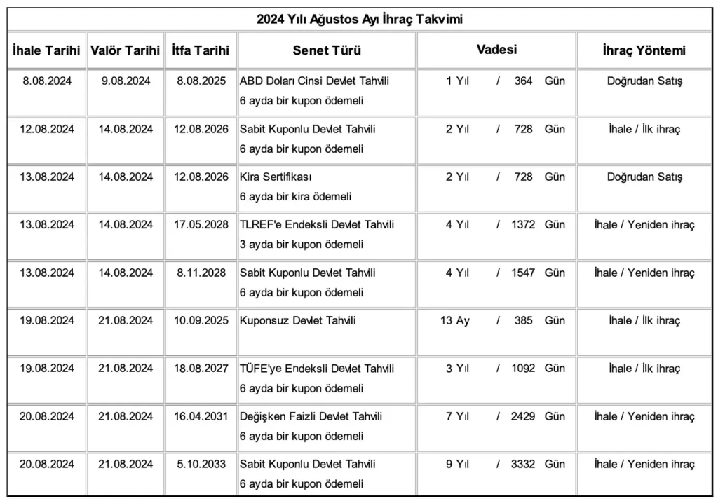 Hazine her ayın sonunda gelecek üç aylık dönemde toplam ne kadar borçlanacağını ve bunun için hangi devlet iç borçlanma senetlerini (DİBS) kullanacağını açıklıyor. Nitekim Temmuz sonunda da Ağustos — Ekim dönemine ilişkin takvimi de yine aylık bazda açıkladı. Bir fikir vermesi bakımından Ağustos ayına ilişkin takvim aşağıda yer alıyor.