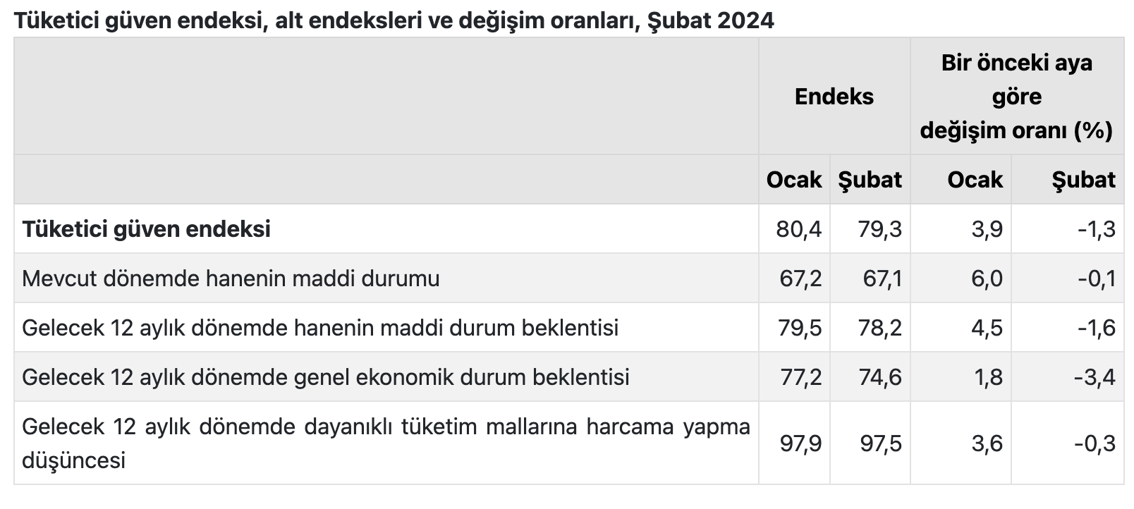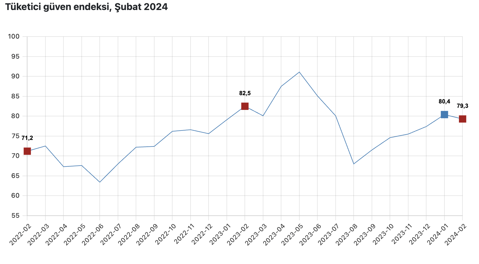 Türkiye İstatistik Kurumu ve Türkiye Cumhuriyet Merkez Bankası işbirliği ile yürütülen tüketici eğilim anketi sonuçlarından hesaplanan tüketici güven endeksi Ocak ayında 80,4 iken Şubat ayında yüzde 1,3 oranında azalarak 79,3 oldu.