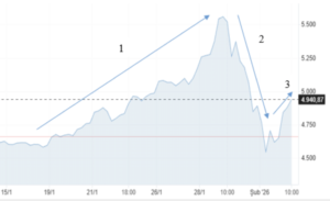 Altın fiyatının (USD/Ons) son 20 gündeki gelişimini gösteren grafik (03.02.2026 saat 12.30) aslında her şeyin özeti gibi. Önce Trump’ın yarattığı risklere İran meselesi de eklenince panik halinde altına hücum yaşanıyor (1 ile gösterilen bölge) ve yaklaşık iki haftada altın ons fiyatı 4.500 dolardan 5.500 dolara fırlıyor. Sonra burada bir anormallik olduğunun farkında olanlar sanki yaratılan bütün risklerin şahin yaklaşımlı bilinen Kevin Warsh’ın Fed Başkanlığı için aday gösterilmesiyle çözüldüğü bahanesiyle kâr realizasyonuna gidiyorlar. Bu kez panik satışlar başlıyor ve altın fiyatı hızla düşüşe geçiyor. Bugün gelinen aşamada panik davranışlar durulmuş gibi görünüyor. Hiç kuşkusuz bu dönemde altın fiyatını yükselten ve yüksekken satıp şimdi tekrar düşükken alan büyük yatırımcılar büyük paralar kazanıyor. Benzer durum gümüşte ve diğer değerli metallerde de söz konusu.