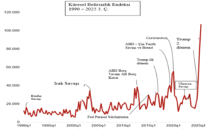 Aşağıda dünya belirsizlik endeksinde 1990’dan bu yana yaşanan değişimler yer alıyor: