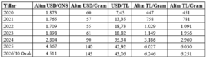 (Kaynak: USD/Ons altın fiyatları için tradingeconomics, USD/TL kurları için TCMB, Altın TL/Gram için; Anlık Altın Fiyatı)