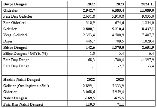 “Merkez Bankası politika faizini değiştirmedi ve yüzde 45 olarak bıraktı. TÜİK tarafından açıklanan enflasyonun yüzde 65 olduğu yerde politika faizini yüzde 45 olarak sabit tutmanın tek bir gerekçesi olabilir: Önümüzdeki dönemde enflasyonda düşüş beklentisi. Böyle bir beklenti gerçekçi mi? Bunu araştırmak için öncelikle enflasyonu olumsuz yönde en fazla etkileyen göstergelerin başında gelen kamu kesimi bütçesine bir bakalım. Aşağıdaki tabloda gösterildiği gibi 2023 yılı bütçesi, başlangıçta öngörülen bütçe açığının iki katından daha yüksek bir açıkla (1.375 milyar lira) sonuçlandı (Kaynak: Hazine ve Maliye Bakanlığı, Muhasebat Genel Müdürlüğü Bütçe İstatistikleri):