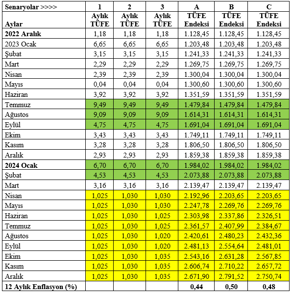 Bu karışık görünümlü tabloyu açıklayarak başlayalım. Tablonun 1 numaralı sütunu sarı boyalı bölgeye kadar gerçekleşmiş aylık TÜFE enflasyonu oranlarını gösteriyor. Sarı boyalı bölüm ise nisan ile aralık ayları arasında enflasyonun her ay yüzde 2,5 gerçekleşeceği varsayımını yansıtıyor. 2 numaralı sütundaki sarı boyalı alan aylık TÜFE enflasyonunun her ay yüzde 3 gerçekleşeceği tahminine dayalı senaryo sonuçlarını gösteriyor. 3 numaralı sütundaki sarı boyalı alan nisan-mayıs aylarında aylık enflasyonun yüzde 3, haziran-temmuz aylarında yüzde 2,5, ağustos-eylül aylarında yüzde 2, son üç ayda da yüzde 3,5 olacağı varsayımına dayalı senaryo sonucunu sergiliyor. A.B ve C sütunları da 1, 2 ve 3 numaralı sütunlardaki varsayımları TÜFE endeksine uygulayarak yıllık enflasyonun 2024 sonunda nereye varacağını gösteriyor. Buna göre yılın kalan 9 ayında enflasyon aylık ortalama olarak yüzde 2,5 gerçekleşirse yılsonunda enflasyon yüzde 44, enflasyon kalan 9 ayda aylık ortalama olarak yüzde 3 gerçekleşirse yılsonunda yüzde 50, aylık olarak inişli çıkışlı gerçekleşirse de yılsonunda yüzde 48 dolayında bir enflasyon oranıyla 2024 yılını tamamlayacağız demektir.