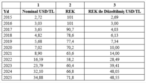 Tablodaki nominal kur ve REK verileri TCMB’den alınmış, REK’e göre düzeltilmiş USD/TL kuru şu formül kullanılarak hesaplanmıştır: