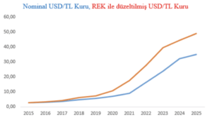 Nominal USD/TL kuru ile REK’e göre düzeltilmiş USD/TL kuru birlikte incelendiğinde, özellikle 2021 yılından itibaren iki seri arasındaki makasın dramatik biçimde açıldığı görülmektedir. Bu ayrışma, dolar cinsinden büyüme göstergelerinde ortaya çıkan algısal (kâğıt üzerindeki) büyümenin temel nedenini oluşturmaktadır.