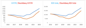 Şimdi bu değerleri, REK’e göre düzeltilmiş kurları kullanılarak hesaplanan alternatif sonuçlarla karşılaştıralım. Aşağıdaki tabloda, nominal kura ve REK’e dayalı alternatif kura göre hesaplanan GSYH ve kişi başına gelir değerleri yer almaktadır (GSYH TL, GSYH USD, Nüfus verileri TÜİK’ten alınmış, reel kura göre düzeltilmiş GSYH USD ve reel kura göre düzeltilmiş kişi başına gelir USD, her iki tablodaki veriler kullanılarak tarafımızdan hesaplanmıştır):