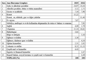 Aşağıdaki tabloda TÜFE endeksinde yer alan mal ve hizmet gruplarının endeksteki ağırlıkları (yüzde olarak) ve 2025 yılıyla karşılaştırmalı olarak yer alıyor: