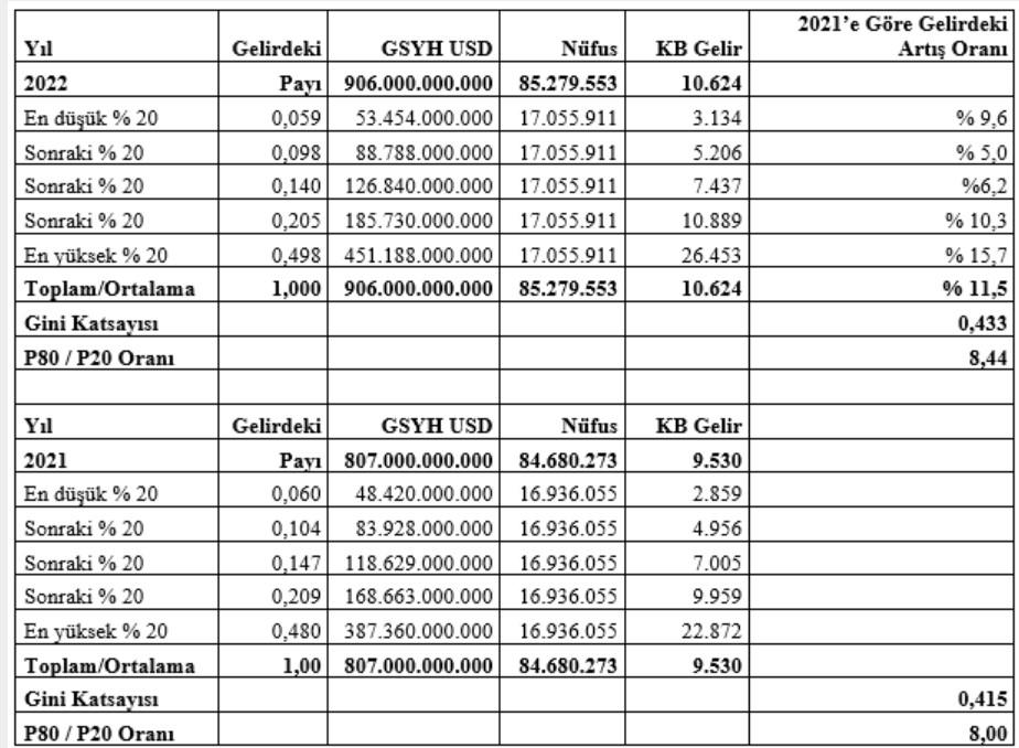 Üstteki tablonun son sütunu iki yılı karşılaştırmaya ayrılmış durumdadır. 2022 yılında bütün gelir gruplarının gelirlerinde 2021 yılına göre artışlar olmasına karşılık asıl büyük artış en yüksek gelir elde eden grupta yaşanmış görünüyor (yüzde 15,7.)