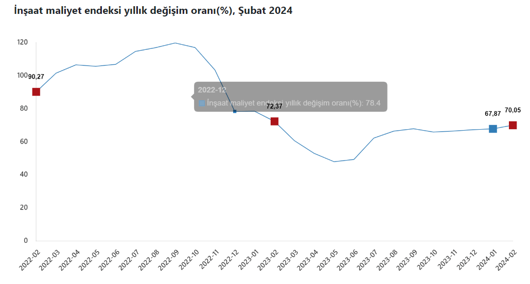 İnşaat maliyet endeksi yıllık yüzde 70,05 aylık yüzde 3,41 arttı Artan dolar kuru ve işçilik maliyetleri nedeniyle inşaat maliyetlerinde artış şubat ayında hızlandı. Türkiye İstatistik Kurumu (TÜİK) Şubat 2024 dönemine ilişkin İnşaat Maliyet Endeksi verilerini açıkladı. Buna göre ocak ayında yıllık yüzde 67,87 artış sergileyen inşaat maliyet endeksi