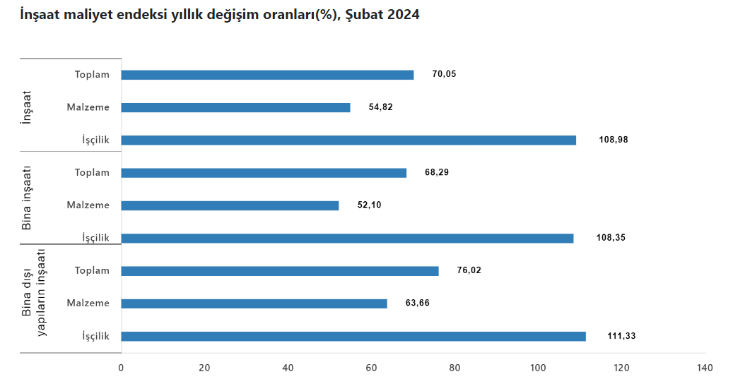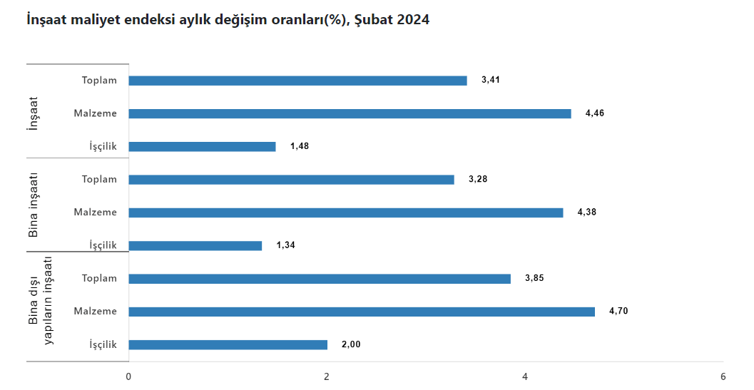 Şubatta bir önceki aya göre malzeme endeksi yüzde 4,46, işçilik endeksi yüzde 1,48 arttı. Ayrıca bir önceki yılın aynı ayına göre malzeme endeksi yüzde 54,82, işçilik endeksi yüzde 108,98 yükseldi.