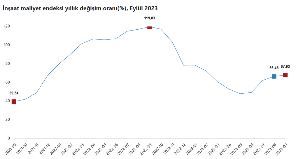 İnşaat maliyetleri artan işçilik ücretleri ve malzeme fiyatları nedeniyle eylül ayında yükseliş trendini sürdürdü. Maliyet endeksi, 2023 yılı Eylül ayında bir önceki aya göre yüzde 2,46, bir önceki yılın aynı ayına göre yüzde 67,93 yükseldi.