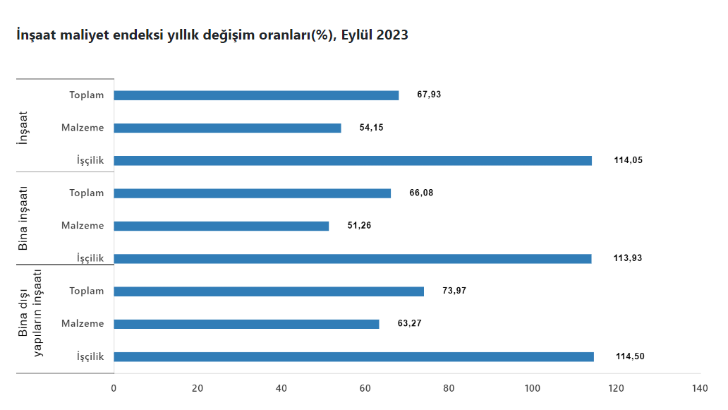 Bina inşaatı maliyet endeksi, eylülde bir önceki aya göre 2,47, geçen yılın aynı ayına göre yüzde 66,08 yükseldi. Eylülde bir önceki aya göre malzeme endeksi yüzde 3,49, işçilik endeksi yüzde 0,21 arttı. Geçen yılın aynı ayına göre malzeme endeksi yüzde 51,26, işçilik endeksi yüzde 113,93 artış kaydetti.