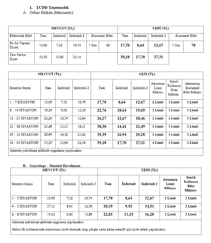 * Marmaray tam parkur 33.20 TL’den 39.16 TL’ye