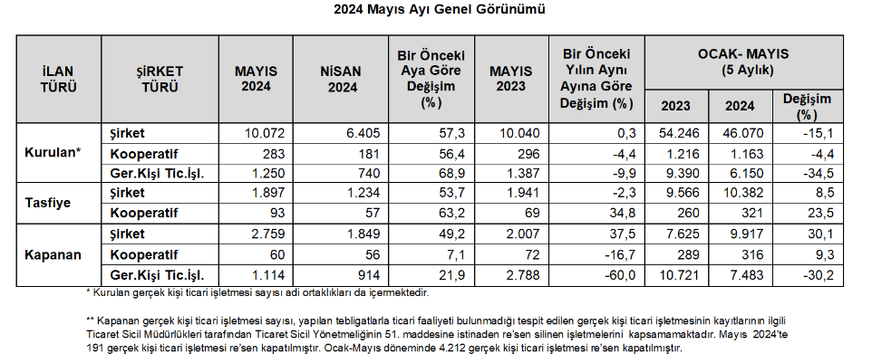 2024’ün ilk 5 ayında 2023’ün ilk 5 ayına göre kapanan şirket sayısı yüzde 30,1 kapanan kooperatif sayısı yüzde 9,3 artarken, kapanan gerçek kişi ticari işletme sayısında yüzde 30,2 azalış oldu.