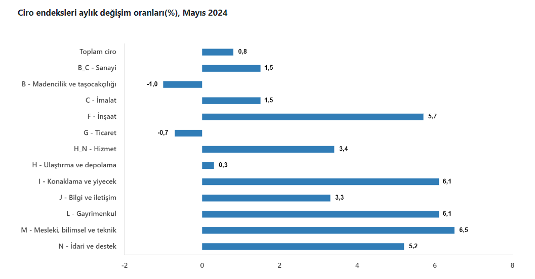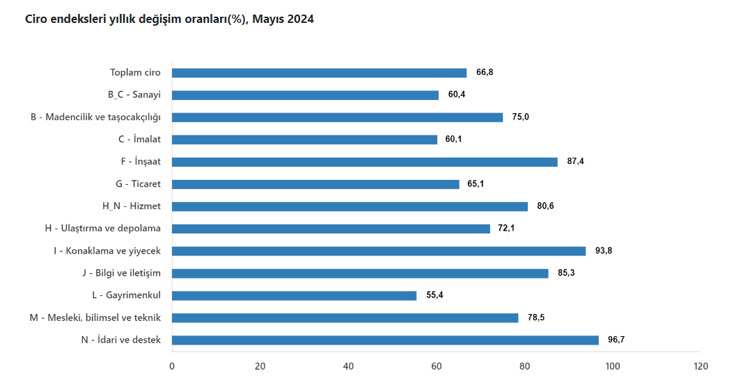Mayıs ayında yıllık sanayi sektörü ciro endeksi yüzde 60,4, ticaret ciro endeksi yüzde 65,1, hizmet ciro endeksi yüzde 80,6 arttı; inşaat ciro endeksi ise yüzde 87 artarak en yüksek ciroyu yapan sektör oldu.