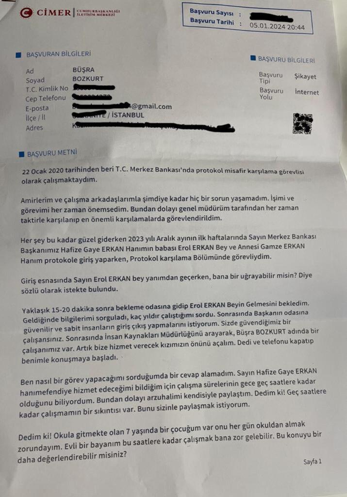 Büşra Bozkurt’un CİMER’ye yaptığı bu şikayetle ilgili haberlerin dün yayılması üzerine Merkez Bankası Başkanı Hafize Gaye Erkan sosyal medya hesabından açıklama yaptı.