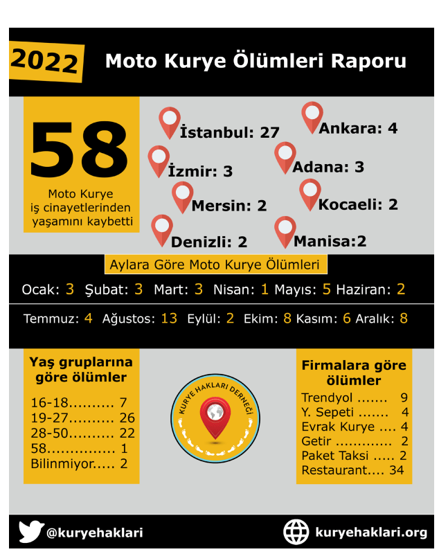 gerçekleşiyor” denildi. Rapora göre Türkiye’de 2022 yılında en az 58 kuryenin trafik kazalarında hayatını kaybettiği belirtilirken, motokuryelerin ölüm oranı özellikle 19-27 yaş aralığındaki üniversite öğrenimi yaşındaki gençlerde artıyor.