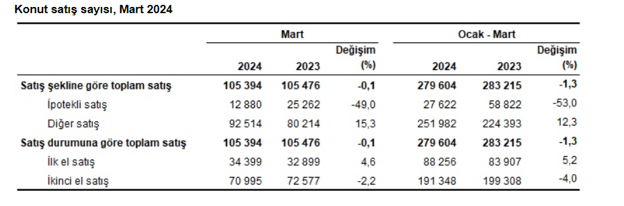 Yüksek konut kredi faizlerine rağmen ipotekli (kredili) konut satışları Türkiye genelinde mart ayında bir önceki aya göre arttı. Martta 8 bin 827 adet olan ipotekli konut satışları martta 12 bin 880’e çıkarken önceki yılın aynı ayına göre yüzde 49,0 azalış gösterdi. Böylece toplam konut satışları içinde ipotekli satışların payı yüzde 12,2 oldu. Ocak-mart dönemindeki ipotekli konut satışları ise önceki yılın aynı dönemine göre yüzde 53,0 azalışla 27 bin 622 oldu. Mart ayındaki ipotekli satışların 3 bin 105’i, ocak-mart dönemindeki ipotekli satışların ise 6 bin 569’u ilk el satış olarak gerçekleşti. Türkiye genelinde diğer konut satışları mart ayında önceki yılın aynı ayına göre yüzde 15,3 artarak 92 bin 514 oldu. Toplam konut satışları içinde diğer satışların payı yüzde 87,8 oldu. Ocak-mart dönemindeki diğer konut satışları ise önceki yılın aynı dönemine göre yüzde 12,3 artışla 251 bin 982 oldu.
