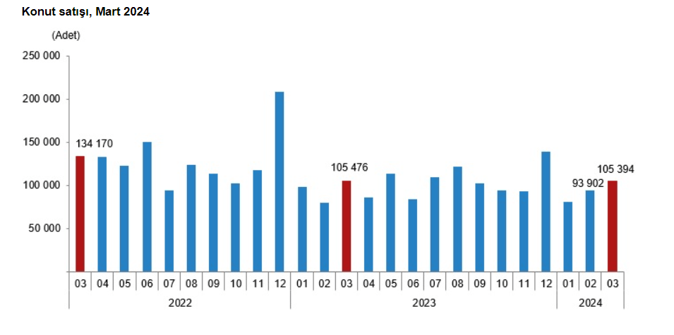 Martta Türkiye genelinde konut satışları şubata göre yüzde 12 artarak 105 bin 394’e çıktı. Türkiye İstatistik Kurumu (TÜİK) mart ayı konut satış rakamlarını açıkladı. Yüksek konut kredi faizleri, ikinci konuta kredi kısıtlamasına rağmen konut satışları martta bir önceki aya göre yüzde 12 artarak 105 bin 394’e çıktı. Ancak geçen yılın aynı ayına göre yüzde 0,1 azaldı. Konut satışları ocak-mart döneminde önceki yılın aynı dönemine göre yüzde 1,3 azalışla 279 bin 604 olarak gerçekleşti.
