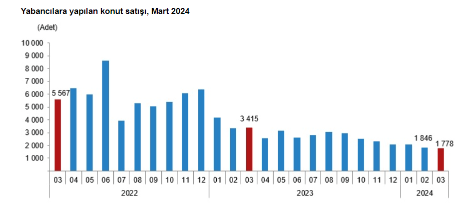 Yabancıya vatandaşlık amaçlı konut satışlarında limitin 400 bin dolara çıkarılması, birçok bölgenin yabancı yerleşimine kapatılması nedeniyle yabancıya satış her ay azalmaya devam ediyor. Yabancılara yapılan konut satışları mart ayında bir önceki yılın aynı ayına göre yüzde 47,9 azalarak bin 778 oldu. Mart ayında toplam konut satışları içinde yabancılara yapılan konut satışının payı yüzde 1,7 oldu. Yabancılara konut satışında ilk sırayı 652 ile İstanbul aldı. İstanbul’u 618 konut satışıyla Antalya ve 151 konut satışıyla Mersin izledi. Yabancılara yapılan konut satışları ocak-mart döneminde ise bir önceki yılın aynı dönemine göre yüzde 48,0 azalarak 5 bin 685 oldu.
