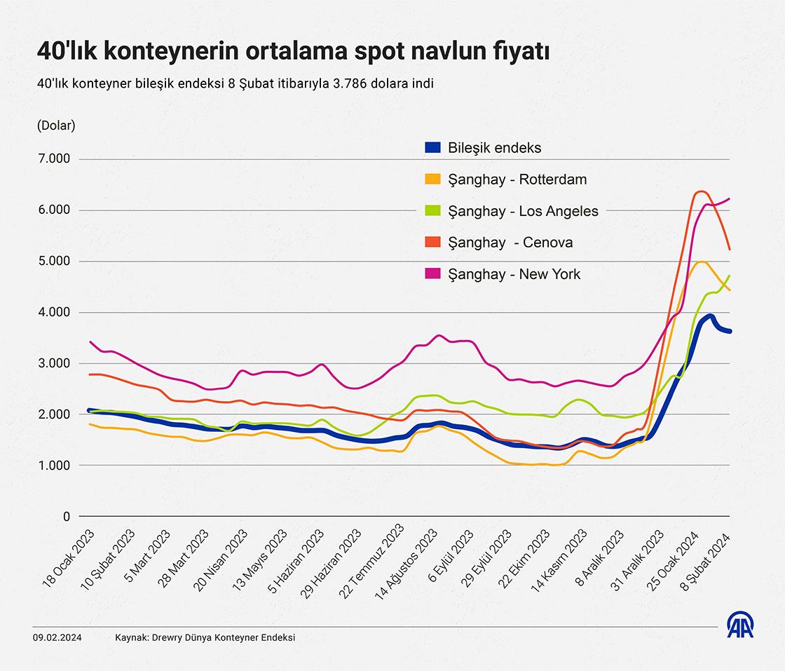 Kızıldeniz'de fiyatlar, sekiz hafta boyunca artarak 25 Ocak'ta 3 bin 964 dolara kadar çıkmıştı. 8 Şubat itibarıyla da 3 bin 786 dolara indi.