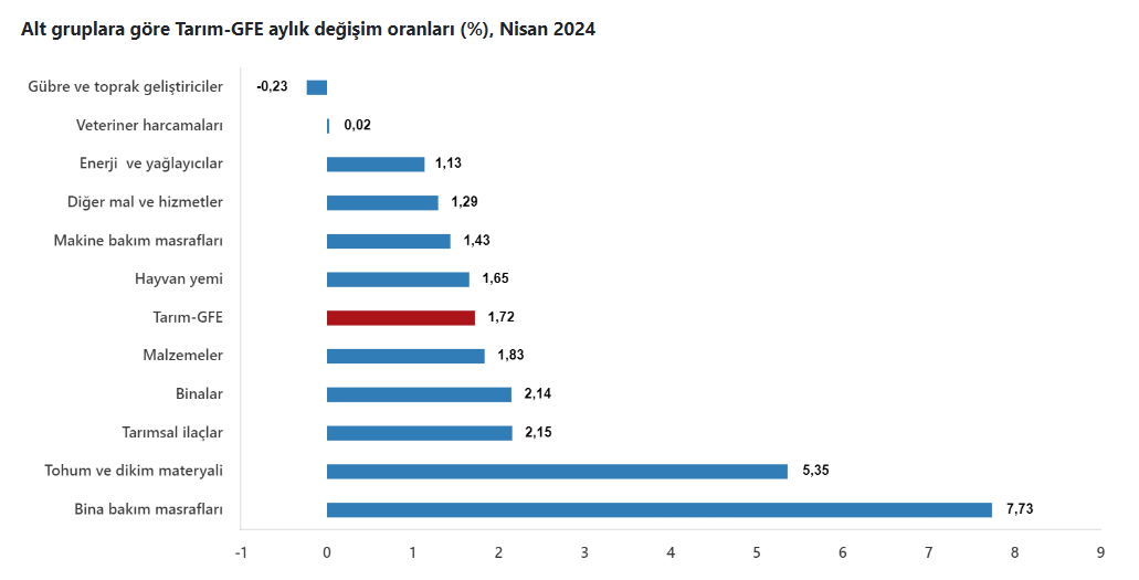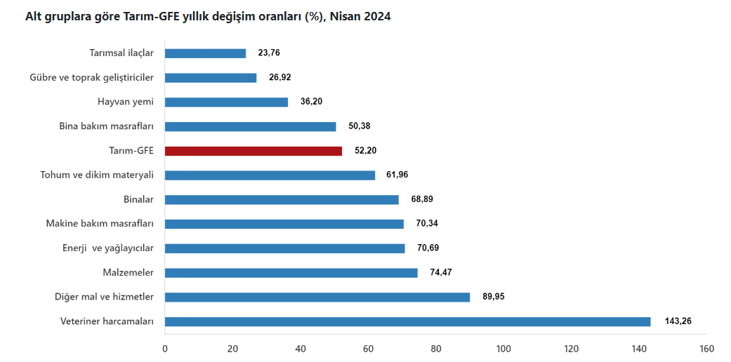 Maliyetleri artıran en önemli unsurlar ise yıl bazında veterinerlik giderleri ay bazında ise artan konut fiyatlarından dolayı bina bakım masrafları oldu. Nisanda veterinerlik giderleri yıllık bazda yüzde 143,26 oranında artış sergilerken, bina bakım masrafları da yüzde 7,73 oranında arttı. Ay bazında çiftçinin masraflarını artıran ikinci unsur ise yüzde 5,35 ile tohum ve dikim materyali oldu. Yıllık bazda rekor kıran veterinerlik masrafları ise ay bazında ise 0,02 artarak gübreden ve toprak geliştiricilerden sonra en az artış gösteren ikinci kalem oldu.
