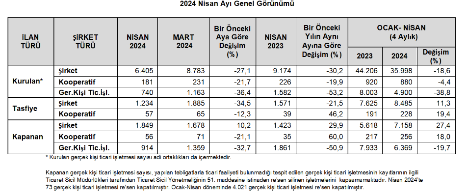 Kurulan şirket sayısı yılın ilk 4 ayında geçen yılın aynı dönemine göre yüzde 18,6 azalarak 35,998 oldu. Geçen yılın aynı döneminde kurulan şirket sayısı 44,206 olmuştu.
