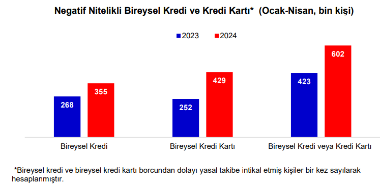 Ocak-nisan döneminde geçen yılın aynı ayına göre bireysel kredi veya bireysel kredi kartı borcundan dolayı yasal takibe düşenlerin sayısı yüzde 42 artışla 602 bin kişi oldu. Geçen yılın aynı döneminde bu rakam 423 bindi.