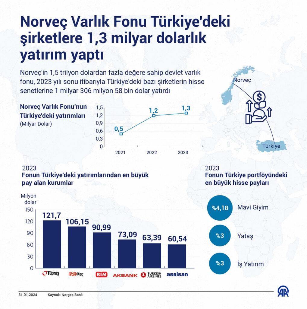 1,6 trilyon dolardan fazla değere sahip Norveç Varlık Fonu 2023 sonu itibariyle Türkiye'deki bazı şirketlerin hisse senetlerine 1 milyar 306 milyon dolar yatırdı. Fonun Türkiye'deki yatırımlarında en büyük payı 121,7 milyon dolarla TÜPRAŞ aldı.