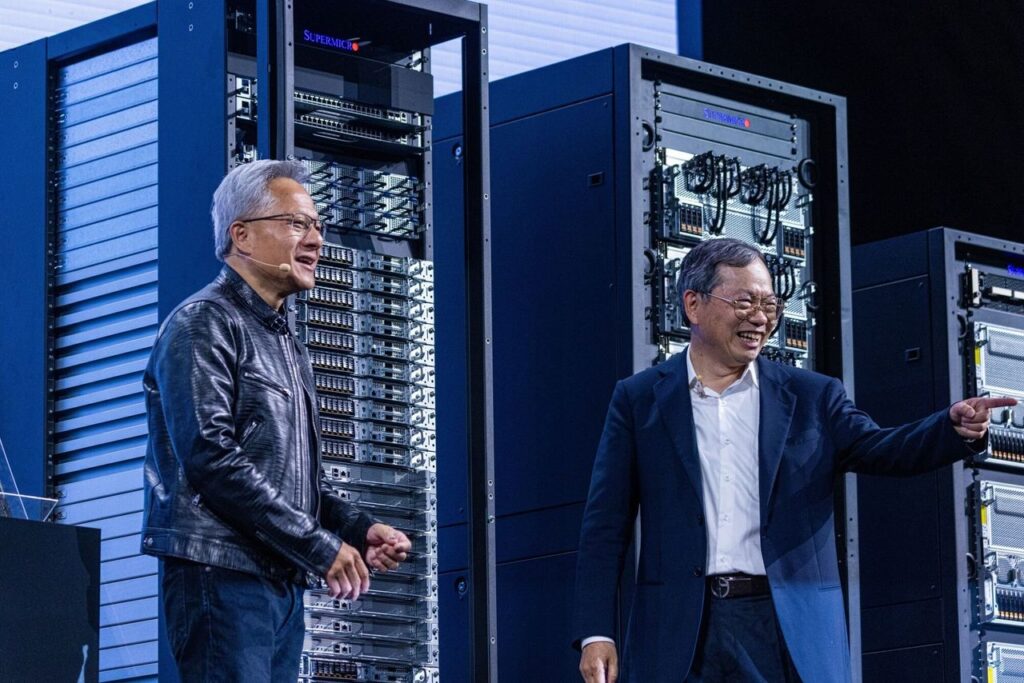 Nvidia CEO’su Jensen Huang (sağda) ve Super Micro Computer’in CEO’su Charles Liang haziranda Taipei’de düzenlenen bir konferansta.