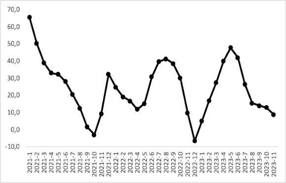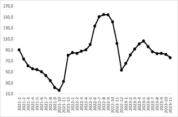 Mayıs ayından itibaren gerilemeye başlayan yıllık fiyat artışı eylülde bir miktar yükselse de ekim ve kasım aylarında düşmeye devam etti ve kasımda yıllık artış yüzde 76,2’ye indi (Şekil 1- alt panel).