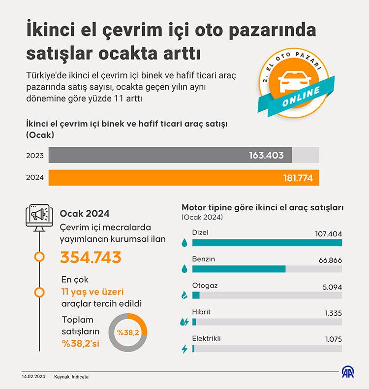 Türkiye'de ikinci el çevrim içi binek ve hafif ticari araç pazarında satış adeti ocakta geçen yılın aynı dönemine göre yüzde 11 artışla 181 bin 774 oldu. En fazla talep ise 11 yaş üstü araçlara gelirken fiyatlarda yüzde 0,09 düşüş görüldü.