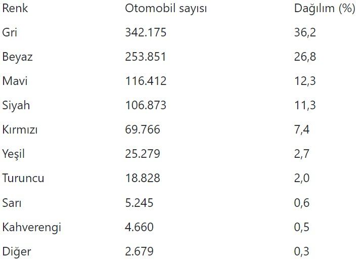 Otomobiller arasındaki renk yarışının geçen yılki galibi gri oldu. Otomobilcilere göre gri diğer renklere göre daha zor kirlenmesi, daha modern ve şık bir renk olarak algılanması ve farklı tonları olması nedeniyle tercih edildi. Otomobilde geçmişte en çok tercih edilen beyaz renk tahtını “griye” kaptırdı. Türkiye İstatistik Kurumu (TÜİK) verilerinden derlenen bilgiye göre geçen yıl trafiğe kaydı yapılan 2,3 milyon taşıttan 945 bin 768’i otomobillerden oluştu.