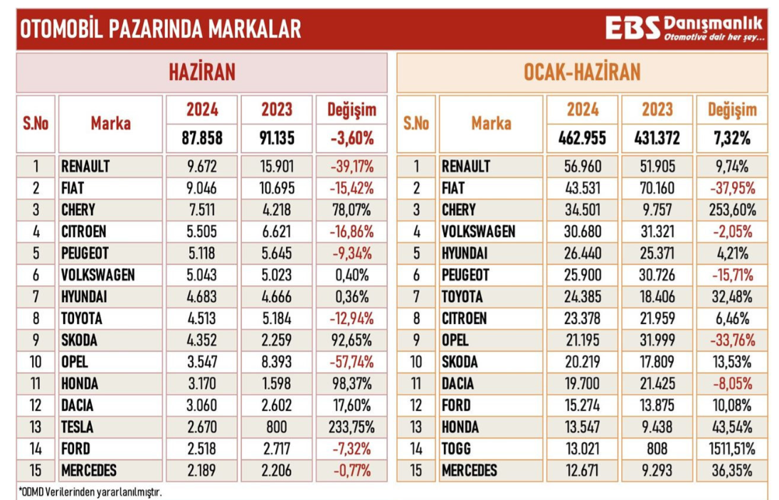 Ocak – haziran tarihlerinde en çok satan marka Renault olurken, geçen yılı aynı dönemine göre satışlarını yüzde 9,74 artırdığı görüldü.