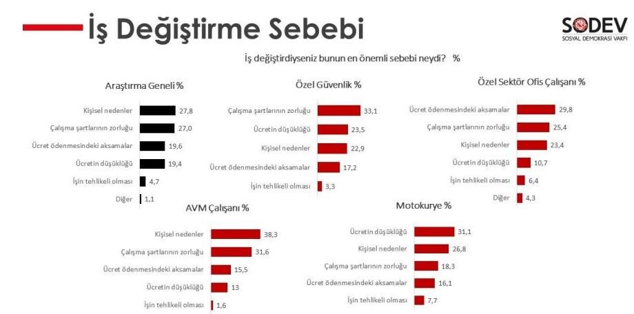 İş değiştirme sebebi sorulan katılımcıların yüzde 40’ı da ücretleri işaret ediyor. Çalışma şartlarının zorluğu ve kişisel nedenler de en sık alınan diğer yanıtlar arasında. Dikkat çekici bir diğer bulgu motokuryelikle ilgili.