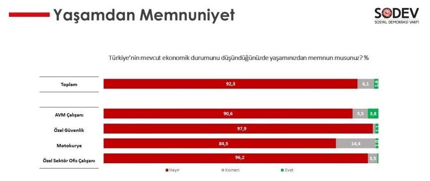 SODEV anketinin en önemli bulgularından biri “Türkiye’nin mevcut ekonomik durumu düşünüldüğünde yaşamınızdan memnun musunuz?” sorusuna verilen cevap. Soruya ankete katılanların yüzde 92,3’ü ‘hayır’ yanıtını veriyor.