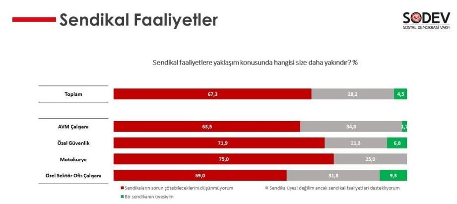 Çalışanların iş güvenceleri ve hak arama konusunda da yetersiz olduklarının tespit edildiği ankete göre, sendikal faaliyetlerin kendilerine bir katkısı olmayacağını söyleyenler çoğunlukta. Buna göre ankete katılanların yüzde 67,3’ü sendikaya üye olmanın işlerine yaramayacağını düşünüyor.