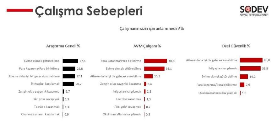 Anketin en çarpıcı sonuçlarından biri “Çalışma sebebiniz nedir?” sorusuna verilen cevap oldu. Katılımcıların yüzde 27,6’sı eve ekmek götürmek için, yüzde 22,8’i para kazanmak için, yüzde 22,1′ ise ailesine daha iyi gelecek sunabilmek için çalıştığını söyledi. Katılımcıların yüzde 70’inden fazlası çalışmanın anlamını ‘geçim ve temel ihtiyaçlar’ olarak tanımladı.