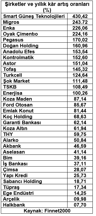 Borsa İstanbul BIST 50 endeksinde yer alan ve Türkiye ekonomisinin omurgasını oluşturdukları söylenebilecek şirketler arasında net kârını yüzde 100’ün üzerinde artırabilen şirket sayısı (Şimdiye kadar açıklanan bilançolara göre) 14’le sınırlı. Büyükler arasında en kabadayısının net kâr artışı yüzde 226.