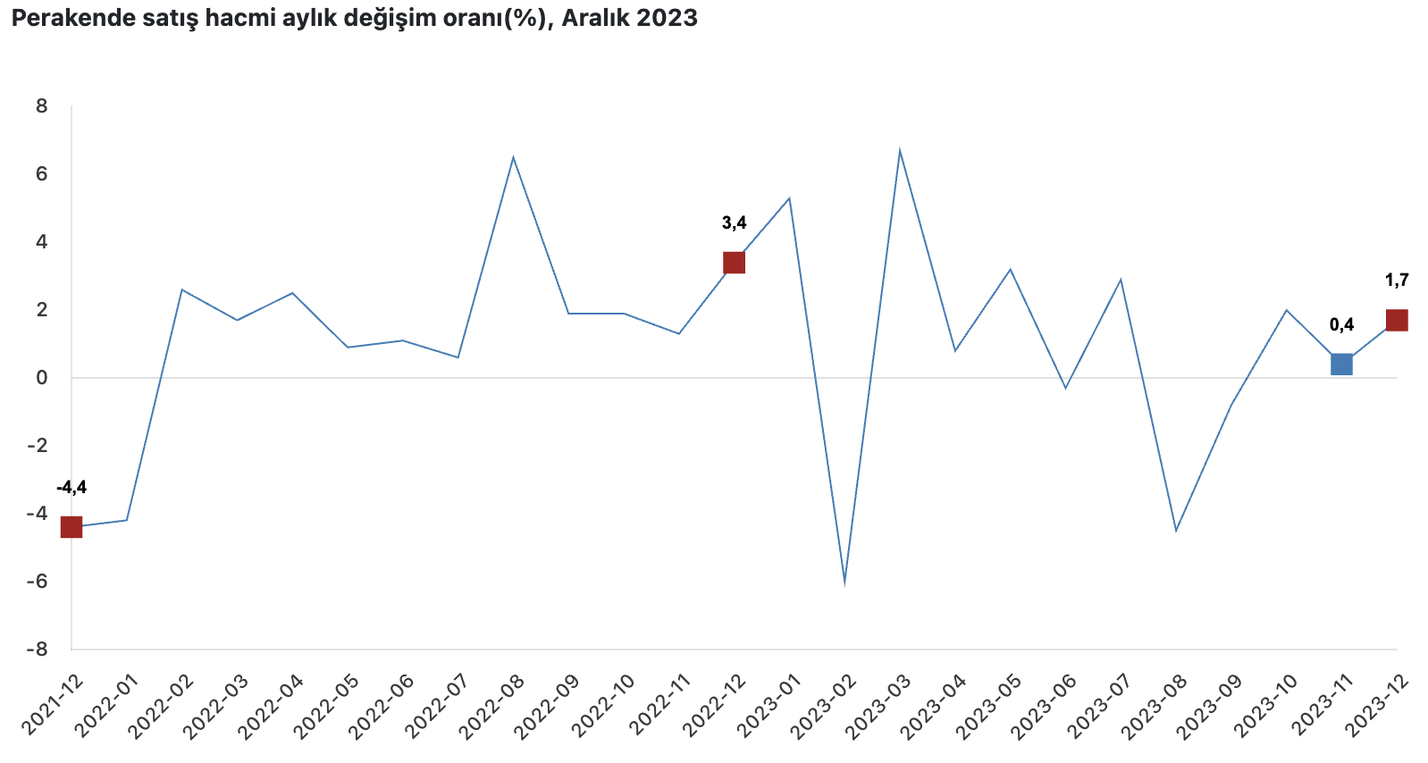 TÜİK'e göre 2023 Aralık'ta sabit fiyatlarla perakende satış hacmi bir önceki aya göre yılbaşı alışverişinin de katkısıyla yüzde 1,7 arttı. Yıllık artış ise yüzde 11,4 oldu. Perakende cirosundaki artış enflasyonun katkısıyla yüzde 80'e ulaştı.