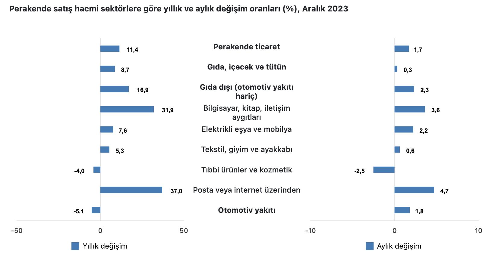 Sabit fiyatlarla perakende satış hacmi (2015=100) 2023 yılı Aralık ayında bir önceki yılın aynı ayına göre ise yüzde 11,4 arttı. Aynı ayda gıda, içecek ve tütün satışlarında bir önceki yüzde yılın aynı ayına göre yüzde 8,7;  gıda dışı satışlarında (otomotiv yakıtı hariç) yüzde 16,9 artarken otomotiv yakıtı satışları ise yüzde 5,1 oranında azaldı. Otomotiv yakıt satışlarındaki yüksek oranlı düşüşte söz konusu dönemde akaryakıt fiyatlarının yüzde 85 civarında artışı etkili oldu.
