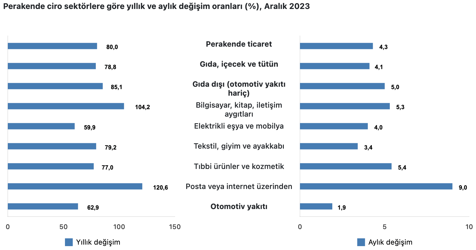 Cari fiyatlarla perakende ciro (2015=100) 2023 yılı Aralık ayında bir önceki aya göre yüzde 4,3 arttı. Aynı ayda ciro gıda, içecek ve tütün satışlarında yüzde 4,1; gıda dışı satışlarında (otomotiv yakıtı hariç) yüzde 5,0;  otomotiv yakıtı satışlarında ise yüzde 1,9 arttı.