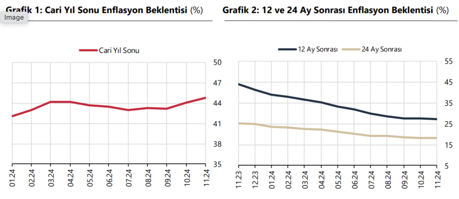 Türkiye Cumhuriyet Merkez Bankası (TCMB) Piyasa Katılımcıları Anketi'ni reel sektörden 17, bankacılık sektöründen 28 ve banka dışı finansal sektörden 23 olmak üzere toplam 68 katılımcını yanıtladı. Piyasa beklentisinin üzerinde gelen ekim ayı enflasyonu yıl sonu enflasyon beletisini az da olsa artırdı. Türkiye Cumhuriyet Merkez Bankası (TCMB) Piyasa Katılımcıları Anketi’nde yıl sonu enflasyon beklentisi yükseldi. TCMB, Kasım 2024’e ilişkin “Piyasa Katılımcıları Anketi” sonuçlarını açıkladı.