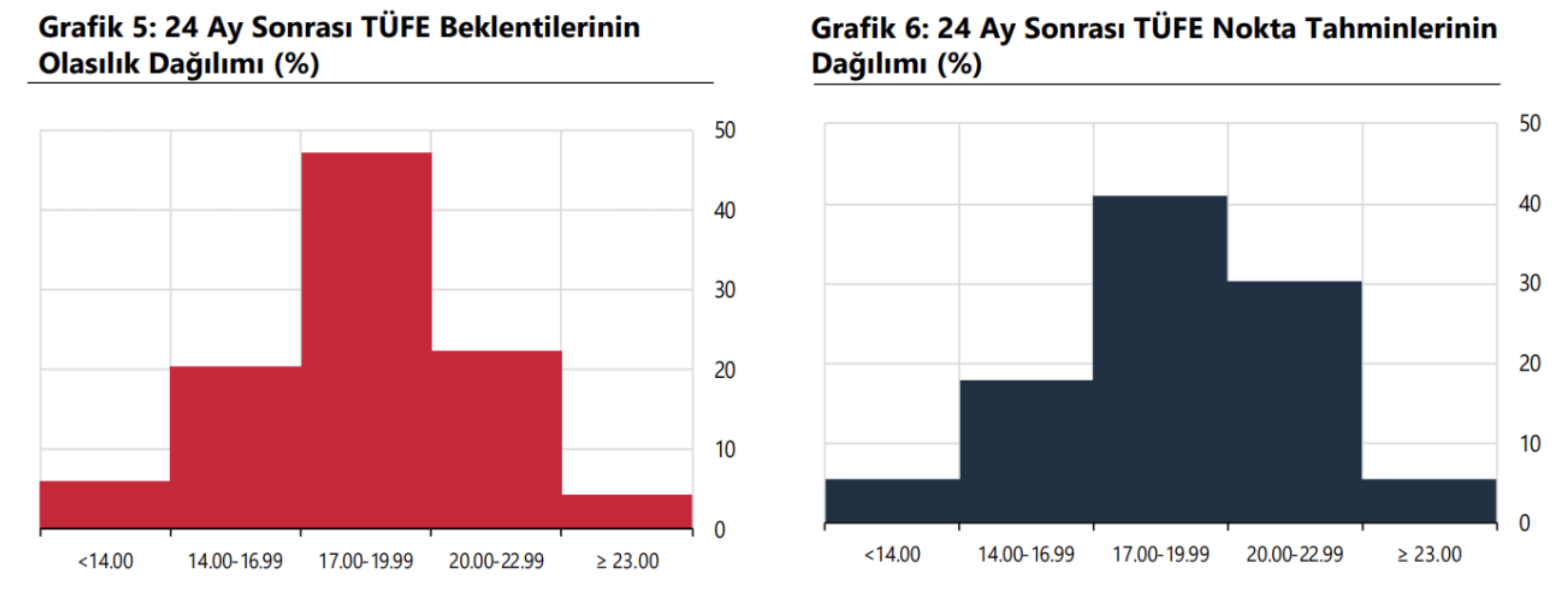 Aynı anket döneminde nokta tahminler esas alınarak yapılan değerlendirmeye göre, 24 ay sonrası TÜFE enflasyonu beklentileri değerlendirildiğinde, katılımcıların yüzde 17,86‘sının beklentilerinin yüzde 14,00 – 16,99 aralığında, yüzde 41,07‘sinin beklentilerinin yüzde 17,00 – 19,99 aralığında, yüzde 30,36‘sının beklentilerinin yüzde 20,00 – 22,99 aralığında olduğu gözlendi.