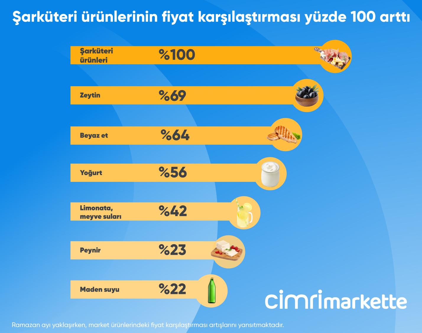 Ramazan alışverişi yapmadan önce fiyatı en çok kıyaslananlar fahiş fiyatları nedeniyle şarküteri ürünleri oldu. Cimri verilerine göre, şarküteri ürünlerinde fiyat karşılaştırması yüzde 100 arttı, onu yüzde 69 ile zeytin, yüzde 64 ile beyaz et izledi.