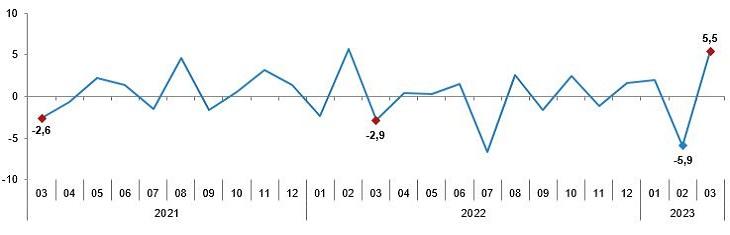 Sanayi üretim endeksi aylık değişim oranları (%), Mart 2023