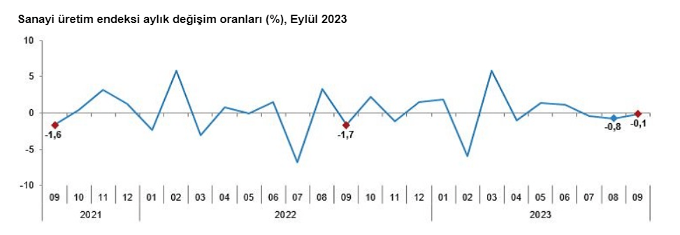Sanayinin alt sektörleri incelendiğinde, 2023 yılı Eylül ayında imalat sanayi sektörü endeksi aynı kaldı ve elektrik, gaz, buhar ve iklimlendirme üretimi ve dağıtımı sektörü endeksi yüzde 2,0 azaldı. Temmuzdan bu yana negatif bölgeye geçen sanayi üretimi “mayınlı tarla”daki yolculuğunu eylül ayında da sürdürdü. Türkiye İstatistik Kurumu’nun (TÜİK) eylül ayı sanayi üretim endeksi verilerine göre sanayi üretimi mevsimsel etkilerden arındırılmış olarak bir önceki aya göre yüzde 0,1 oranında azaldı. Böylece temmuz ayında sanayi üretiminde başlayan düşüş 3’üncü ayına girdi. Üretim, yıllık bazda ise yüzde 4 artış kaydetti.