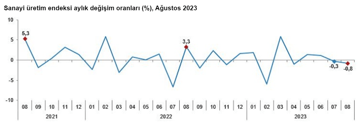 Sanayi üretiminde temmuzda başlayan daralma, ağustosta da sürdü. Ağustosta sanayi üretimi mevsimsel etkilerden arındırılmış olarak bir önceki aya göre yüzde 0,8 daraldı.