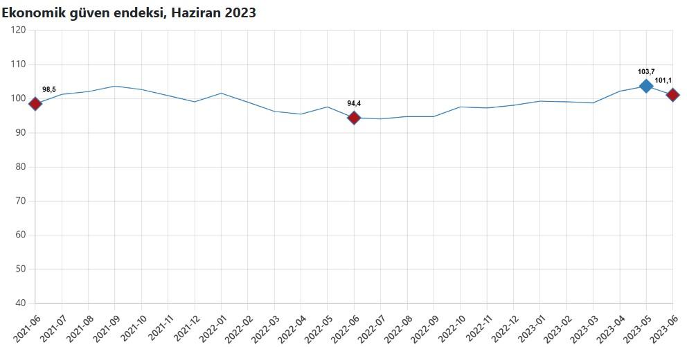 Seçimin ardından tüketici güven endeksinin yüzde 6,5 oranında düşmesinin ardından ekonomik güven endeksi de haziran ayında yüzde 2,5 oranında azalarak 101,1 değerini aldı.